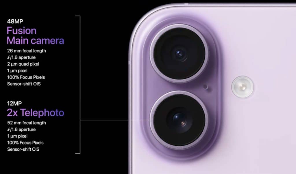 Впервые для обычного iPhone базовая модель оснащена двумя 48-Мп камерами: основной и сверхширокоугольной с макрорежимом. Основная камера также поддерживает съемку с двукратным оптическим зумом без потери качества. Благодаря Photographic Styles можно настраивать цвет, свет и тени прямо во время съемки с более точной передачей оттенков кожи. В iOS 26 появится новый стиль Bright, который делает кожу светлее и добавляет яркость всему кадру.
