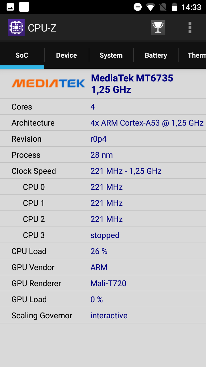 Как уже было отмечено, смартфон оснастили 4-ядерным процессором MediaTek MT6737 с тактовой частотой 1.3 ГГц, графикой Mali-T720 MP2, 3 ГБ оперативной памяти, 16 ГБ встроенной памяти и поддержкой карт microSD до 128 ГБ.