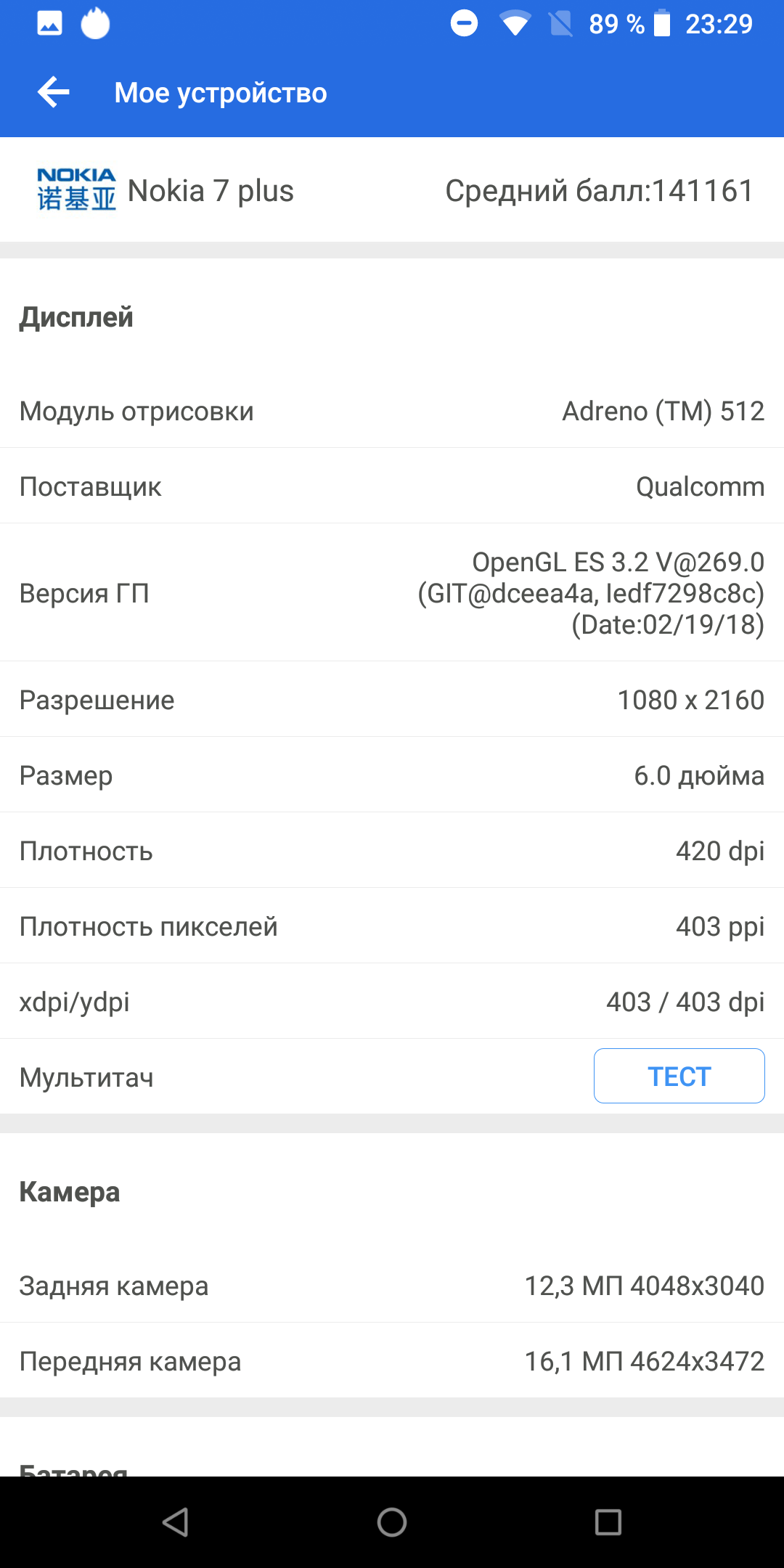 В синтетических тестах Nokia 7 Plus показал очень хорошие, как для среднего класса, результаты. Например, в тесте AnTuTu телефон набрал 137687 баллов.