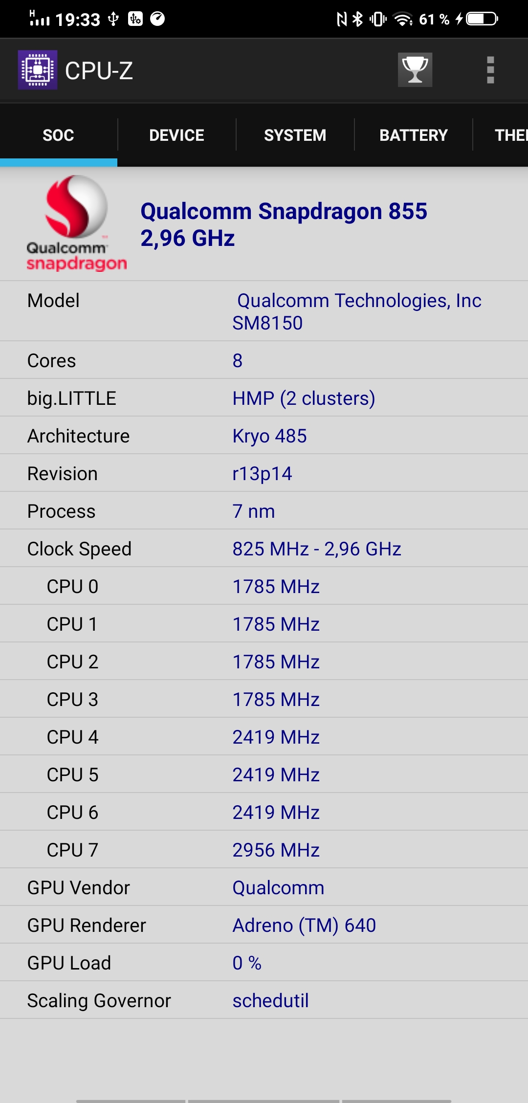 - Чип: 7-нм Qualcomm Snapdragon 855 Plus с 1 ядром Kryo 485 с тактовой частотой 2.96 ГГц, 3 ядрами Kryo 485 с тактовой частотой 2.42 ГГц, 4 ядрами Kryo 485 с тактовой частотой 1.8 ГГц и графикой Adreno 640;