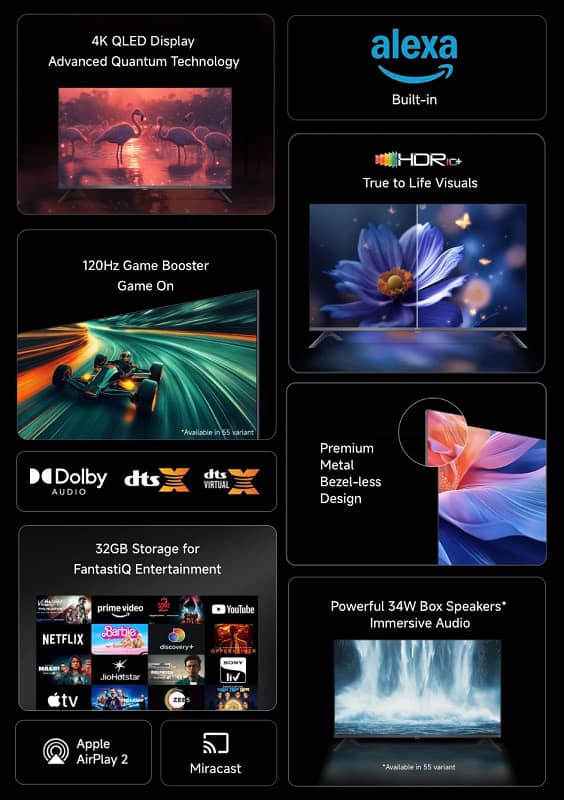 Оба телевизора оснащены встроенным хранилищем объемом 32 ГБ. Аудиосистема поддерживает Dolby Audio и DTS:X, при этом в 55-дюймовой версии установлены динамики мощностью 34 Вт, а в 43-дюймовой — 30 Вт.