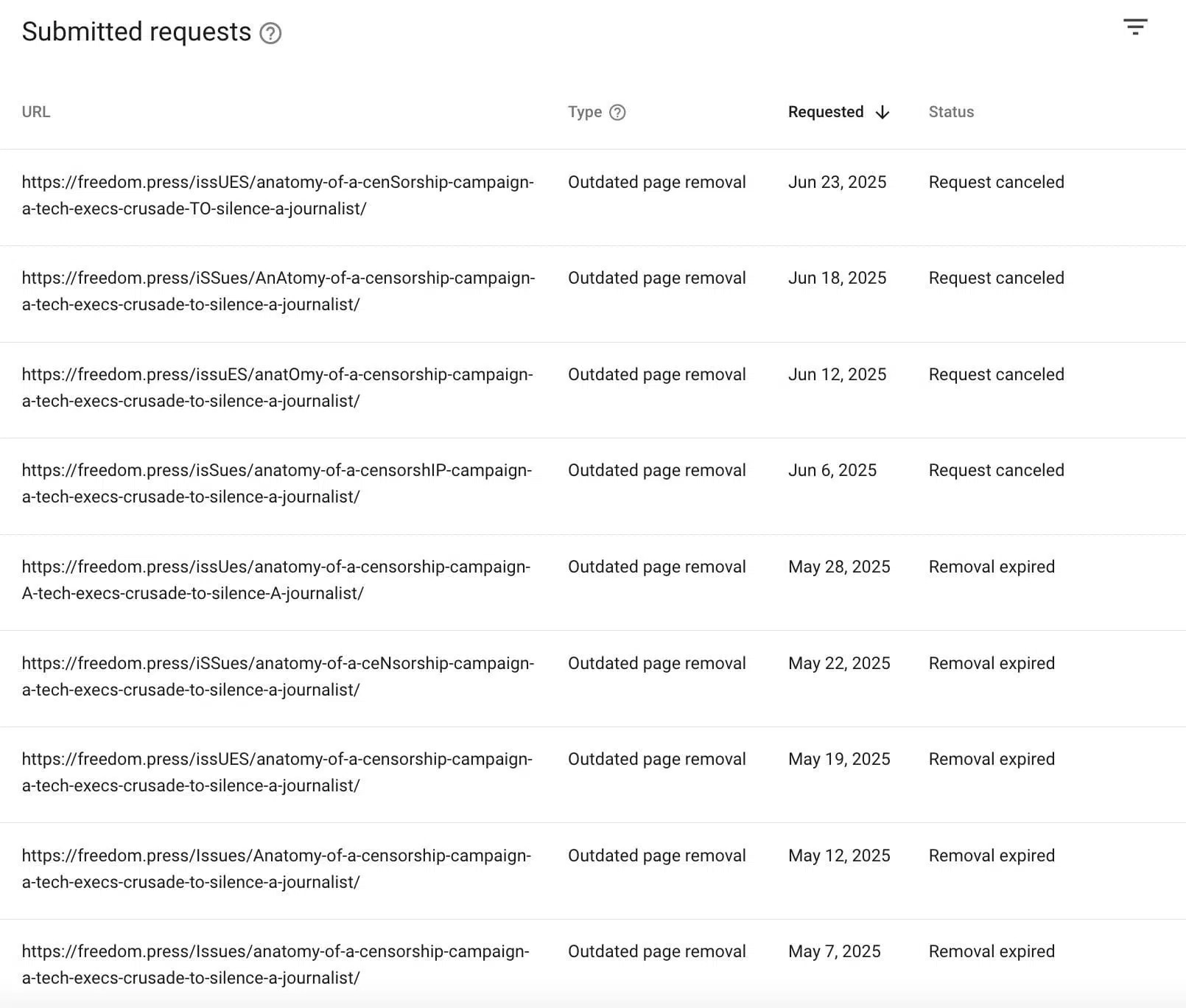 Полсон також з'ясував, що хтось із травня до червня неодноразово надсилав до Google запити на повторну перевірку сторінки. Це підтвердили дані з консолі пошуку Google.