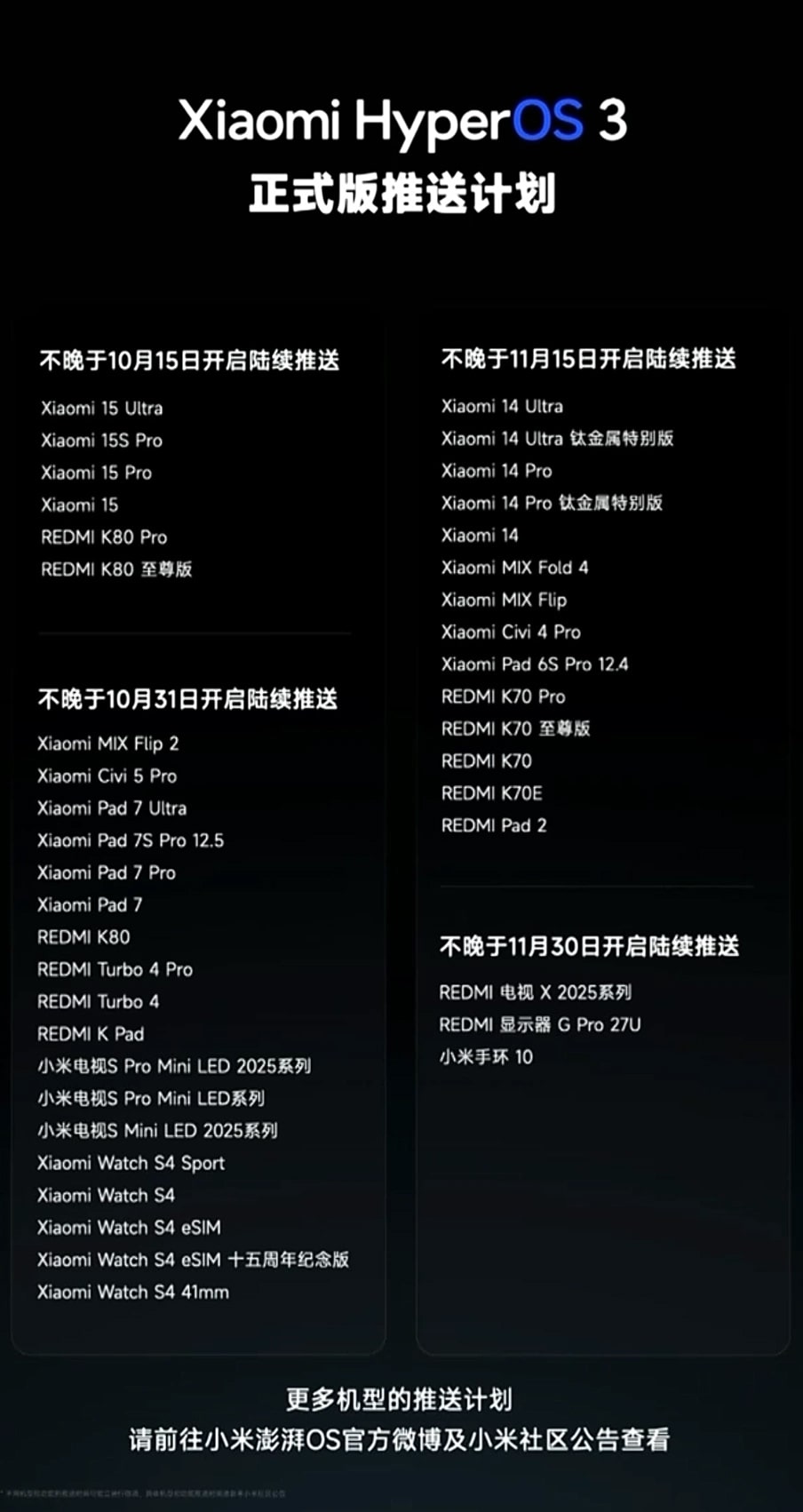 Xiaomi оголосила, що HyperOS 3 почне надходити на всі заявлені моделі, починаючи з 15 жовтня. У першу хвилю потрапили такі моделі: