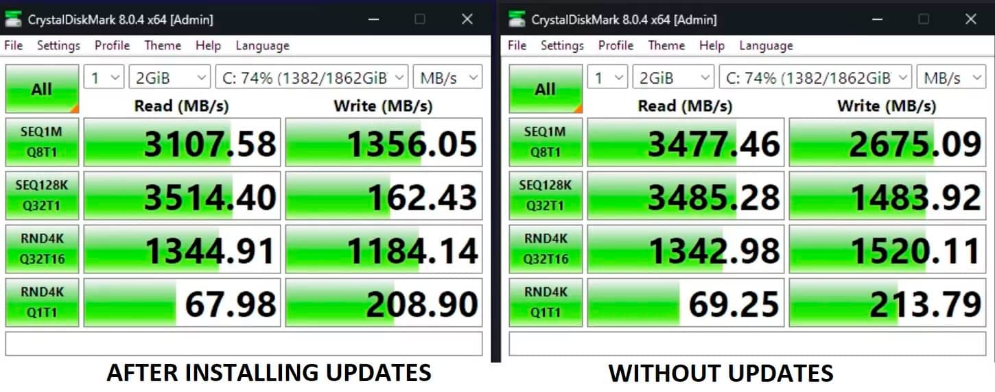 Тести, проведені за допомогою утиліти CrystalDiskMark, показали, що швидкість роботи SSD може з 7000 МБ/с знизитися до 3000 МБ/с, а в окремих випадках і до 1000 МБ/с. Користувачі зазначили, що вилучення оновлень, випущених після березневого «вівторка», відновлює швидкість роботи твердотільних накопичувачів.