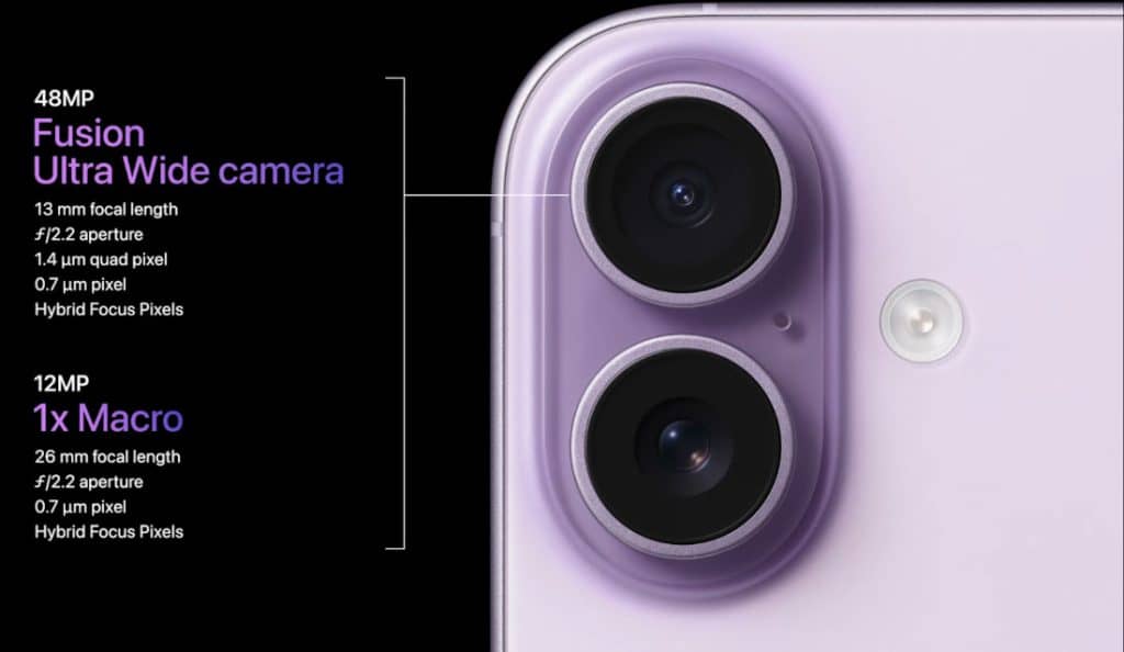 Вперше для звичайного iPhone базова модель оснащена двома 48-Мп камерами: основною та надширококутною з макрорежимом. Основна камера також підтримує зйомку з двократним оптичним масштабуванням без втрати якості. Завдяки Photographic Styles можна настроювати колір, світло та тіні прямо під час зйомки з більш точною передачею відтінків шкіри. У iOS 26 з'явиться новий стиль Bright, який робить шкіру світлішою та додає яскравості всьому кадру.