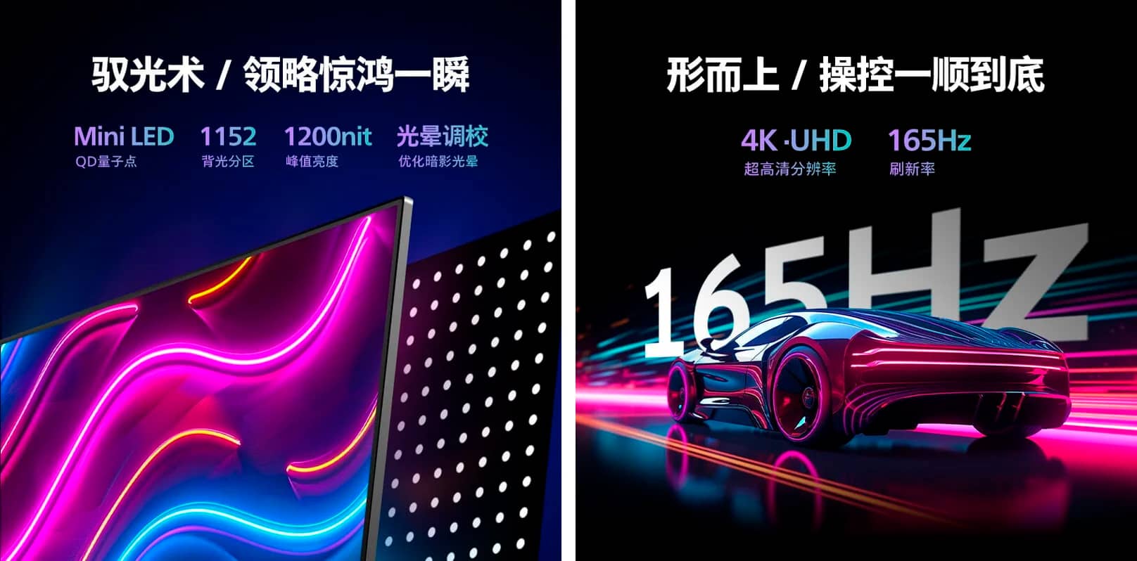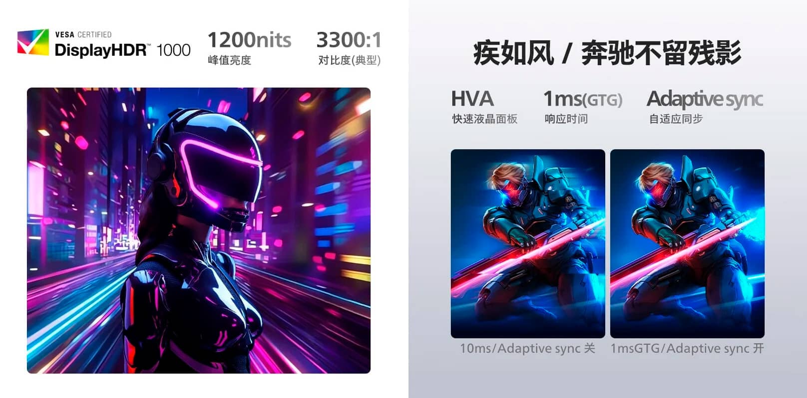 Розмір дисплея складає 27 дюймів. Його роздільна здатність — 3840x2160 пікселів. Частота оновлення екрана з HVA-матрицею дорівнює 165 Гц, а пікова яскравість досягає 1200 ніт. Швидкість відгуку становить 1 мс, контрастність — 3300:1. Головною особливістю монітора стало підсвічування QD-MiniLED. Воно використовує 4608 світлодіодів, які поділені на 1152 зони локального затемнення.