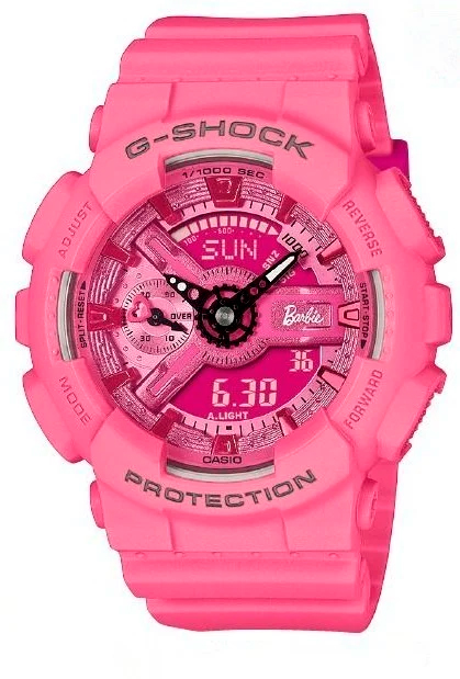 Годинник заснований на популярній серії Casio GMA-S110 і виконаний у яскравому рожевому дизайні з різними відтінками на циферблаті, корпусі та ремінці. Вони прикрашені брендом Барбі і мають серце на індикаторі швидкості.