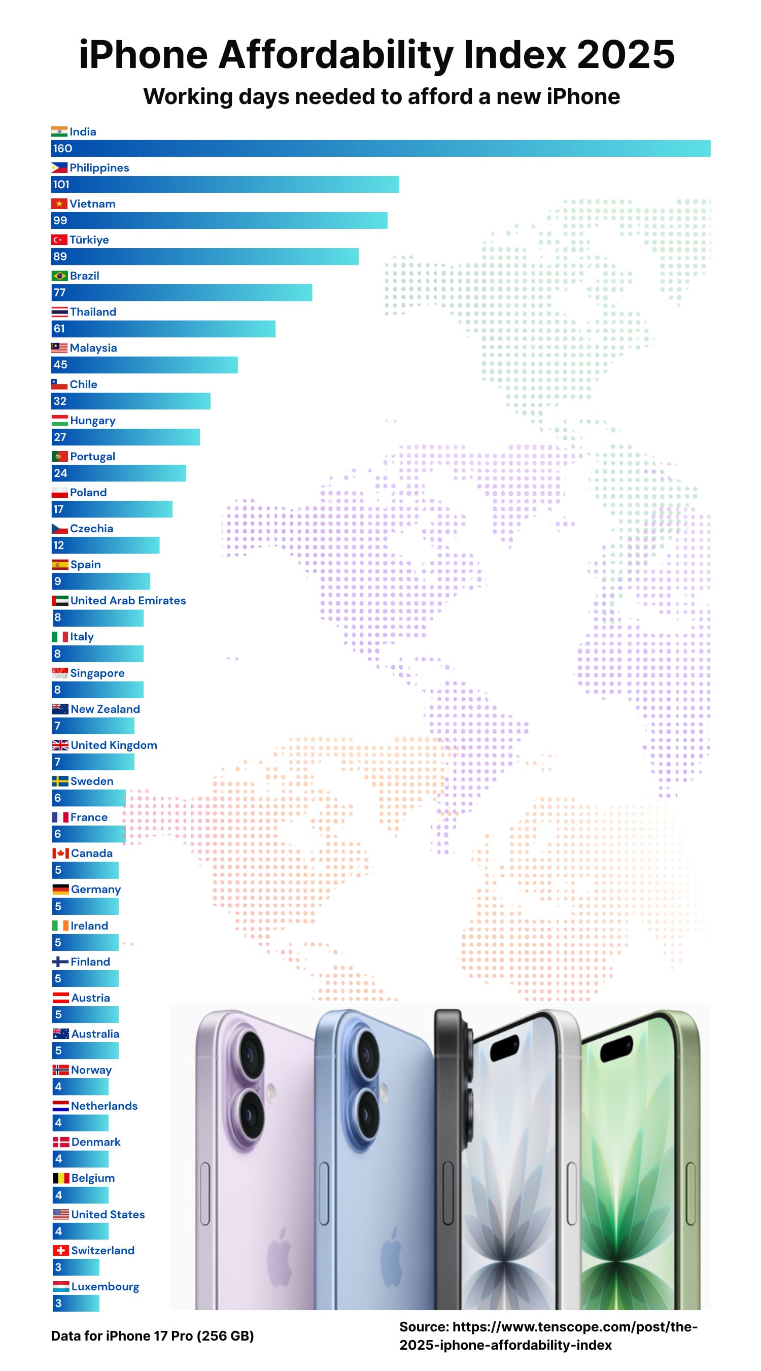 - Щоб заробити на iPhone 17 Pro у Люксембурзі знадобиться близько трьох днів, а в Індії — 160 днів.