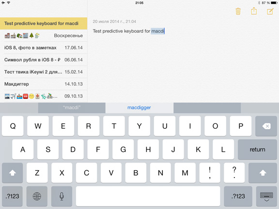 Хотя Apple предоставила интерфейс для разработки «неродных» клавиатур, штатное приложение составит достойную альтернативу скоростным методам набора текста благодаря предикативному вводу. В дополнение к автокоррекции, знакомой по предыдущим версиям iOS, клавиатура не только достраивает слово по первым буквам, но и предсказывает следующие слова в зависимости от контекста сообщения. Учитываются содержание диалога и имя получателя. Кроме того, со временем приложение отслеживает манеру письма пользователя в различных программах с тем, чтобы предлагаемые выражения различались в деловой переписке и в SMS. Жаль только, что русский язык пока не поддерживается.