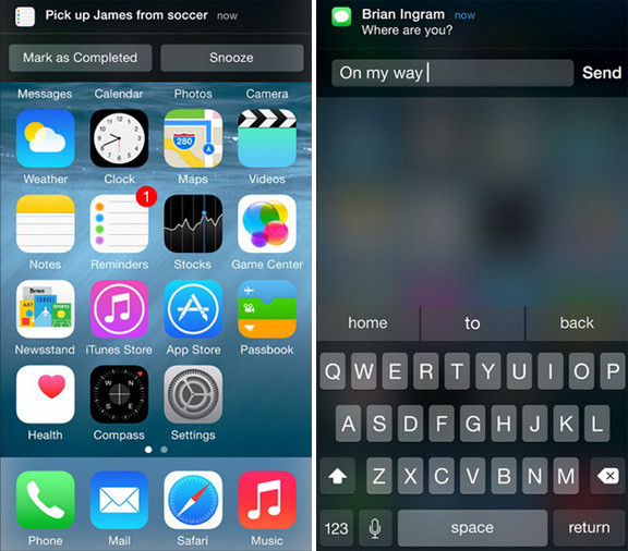 В iOS 8 появились активные оповещения: можно отвечать на SMS или сообщения из соцсетей, не открывая сами приложения. То же справедливо для почты, будильника, напоминаний и других приложений. Благодаря интерактивным уведомлениям можно взаимодействовать с программами, не открывая их в полный экран и не сворачивая работающую программу. К примеру, если на iPhone пришла SMS, ответить на нее можно прямо в окне с уведомлением. То же самое касается и социальных сетей: если кто-то написал пост на Facebook, можно лайкнуть его во всплывающем окне, не запуская клиент.