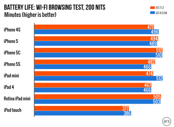 Эксперты Ars Technica изучили проблему и получили подтверждения того, что, на самом деле, некоторые гаджеты под управлением новой ОС работают меньше, чем те, на которых была установлена iOS 7.1.2.