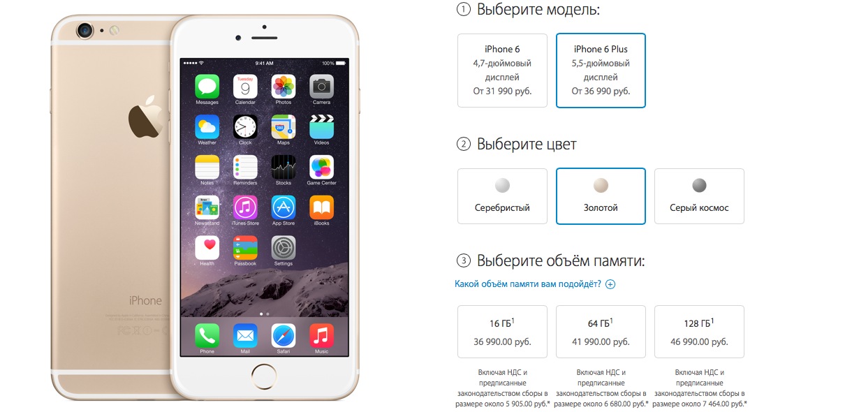 Apple официально объявила, что цена на смартфон iPhone 6 с 16 Гб выстроенной памяти составит 31 990 рублей, а iPhone 6 Plus в минимальной комплектации обойдется покупателям в 37 000 рублей. Цена на iPhone 5s в России снизится до 25 000 рублей.