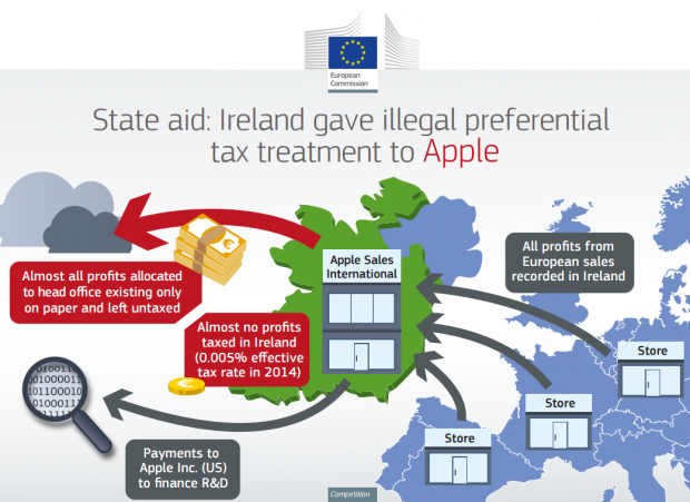 Согласно сообщению на сайте европейского ведомства, Ирландия продемонстрировала «выборочное отношение» к Apple и позволила компании платить налоги на прибыль по эффективной ставке в 1%, в результате чего Apple получила незаконные налоговые льготы на сумму до €13 млрд.