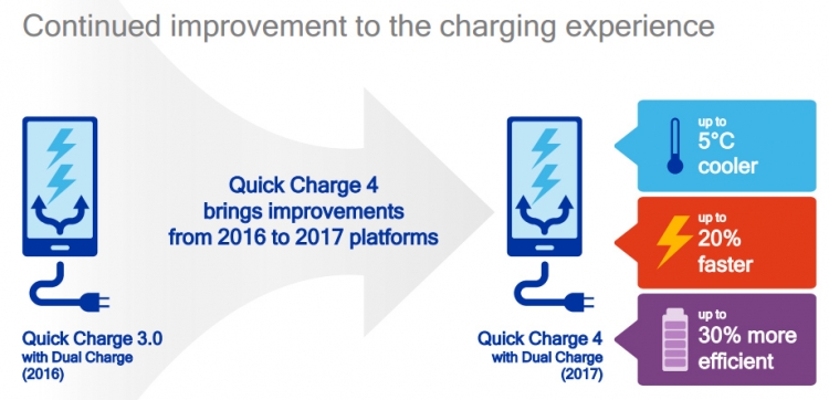 Новый процессор также станет первым, который будет поддерживать новую технологию Quick Charge 4. Qualcomm утверждает, что Quick Charge 4 обеспечивает на 20% быстрее зарядку и увеличенную на 30% эффективность подзарядки, в сравнении с Quick Charge 3. В сравнении же со стандартом Quick Charge 1.0 четвёртое поколение быстрее уже в 2,5 раза. Чтобы с использованием Quick Charge 4.0 получить запас энергии, достаточный для работы среднестатистического смартфона в течение пяти часов, достаточно подключить его к блоку питания на пять минут. Если же оставить аппарат заряжаться на 15 минут, то заряд его аккумулятора пополнится наполовину. Стоит отметить, что испытания проведились на телефоне с аккумулятором емкостью 2750 мАч.