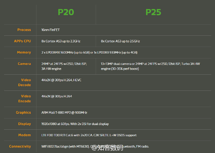 Helio P25 использует 16нм технологический процесс FinFET, благодаря чему снизилось энергопотребление на 25% по сравнению с предыдущими процессорами серии P. P25 имеет 8-ядерную архитектуру, состоящую из восьми ядер Cortex-A53. Он имеет максимальную тактовую частоту 2,5 ГГц и графический ускоритель Mali-T880, работающий на частоте 900 МГц. Новый чипсет также поддерживает до 6 ГБ оперативной памяти LPDDR4X и работу LTE.