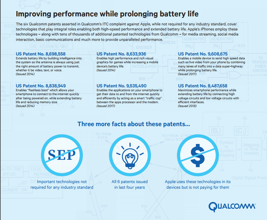 Согласно жалобе, поданной Qualcomm в ITC, iPhone, которые производятся в Китае, не должны быть импортированы в США, если они нарушают патенты Qualcomm. Дело, поданное в Окружной суд США Южной Калифорнии, требует возмещения ущерба за нарушение патентных прав.