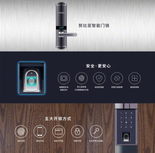 Nubia говорит, что дверной замок имеет чип шифрования на банковском уровне и распознавание отпечатков пальцев военного класса.