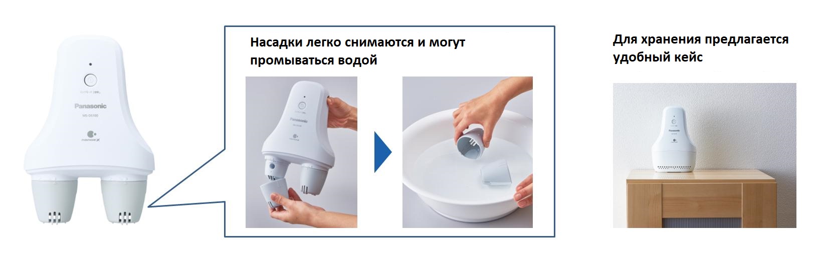 Разработка японских инженеров использует патентованную технологию nanoe X для нейтрализации запахов. Суть последней заключается в генерации большого количества мельчайших отрицательно заряженных ионов (от 5 до 20 нм каждый), способных проникать глубоко в ткани и нейтрализовать частицы, вызывающие неприятный запах.