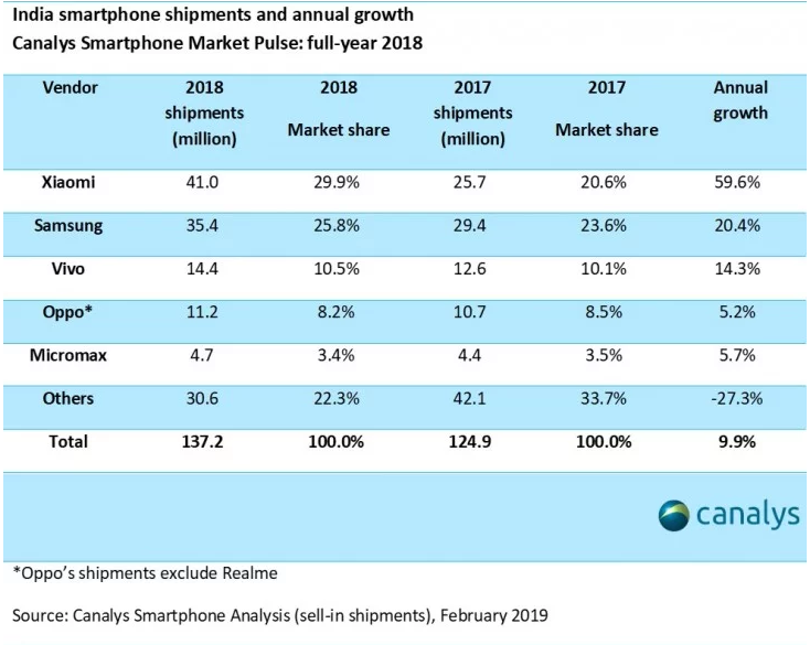 Местный мобильный рынок в отчетный период возглавила компания Xiaomi, которой удалось похвастаться долей 29.9% — 41 млн смартфонов. На втором месте с долей 25.8% (35.4 млн смартфонов) мы видим Samsung. Третье место за Vivo, которая отгрузила 14.4 млн смартфонов (10.5%).