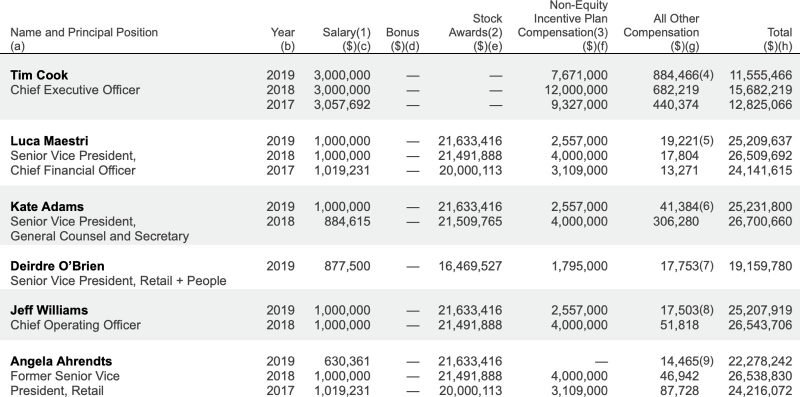 Все руководители Apple заработали значительно больше, чем средняя зарплата в Apple, которая составляет $57596 из-за большого количества сотрудников розничной торговли и службы поддержки. Тим Кук заработал в 201 раз больше, чем среднестатистический сотрудник компании.