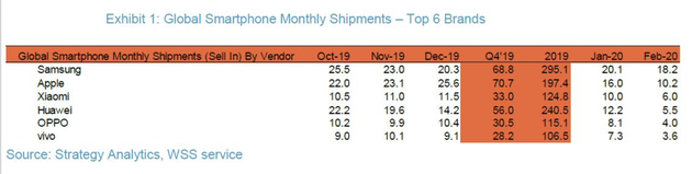 Также отмечается, что в списке лидеров мобильного рынка произошли серьёзные изменения. Huawei теперь занимает не второе место, а сразу четвертое, продав в феврале 5.5 млн смартфонов.