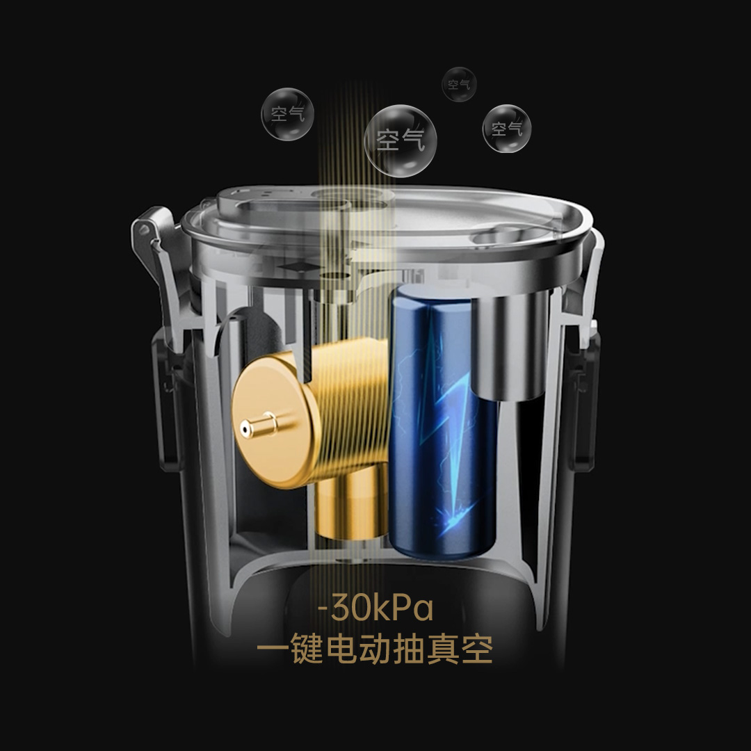 Как следует из названия, соковыжималка оснащена вакуумной функцией, которая используется для откачки воздуха после использования. Для вакуумации требуется всего одна кнопка и 15 секунд, благодаря чему можно предотвратить окисление остатков плодов. Вакуум может поддерживать давление -30 кПа в течение 4 часов.