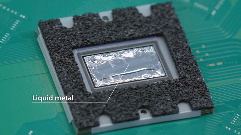 Внутри PlayStation 5 находится системная плата, на которой находится процессор, GPU, восемь чипов оперативной памяти GDDR6 и три чипа SSD памяти. В качестве термоинтерфейса CPU используется так называемый жидкий металл, который обеспечивает лучшее отведение тепла в сравнении с аналогами.