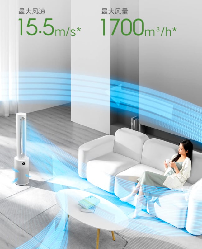 Безлопастный очистной вентилятор также имеет инновационную конструкцию воздуховода с 10-метровой широкой циркуляцией, максимальной скоростью ветра 15,5 м/с и максимальным объемом воздуха 1700 м³/с.