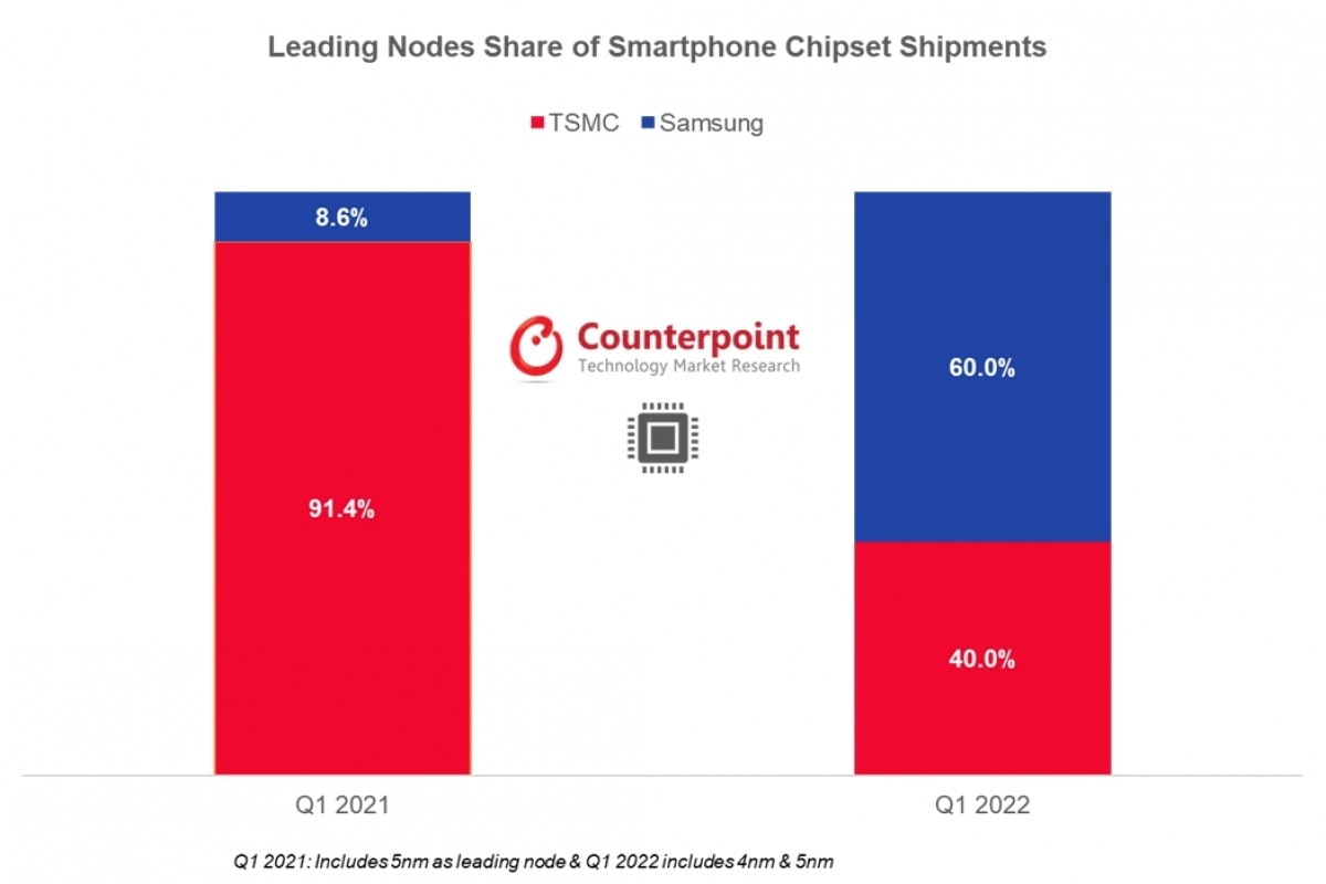 Samsung действительно одержала верх с точки зрения доли узлов чипсета для смартфонов в первом квартале 2022 года на уровне 60%, в основном за счет Snapdragon 8 Gen 1 от Qualcomm.