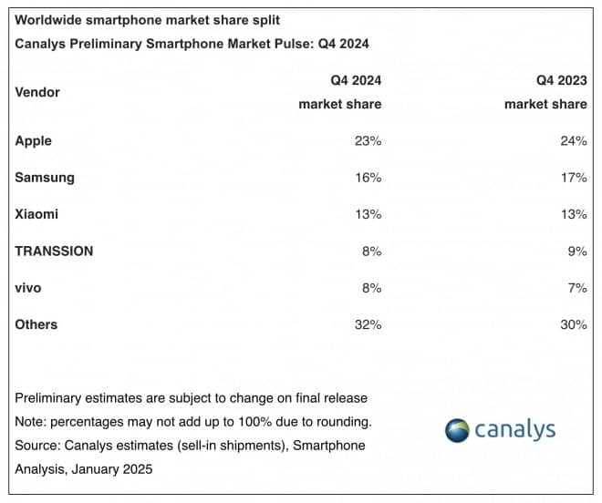 Apple укрепила свои позиции благодаря росту на развивающихся рынках Юго-Восточной Азии и Индии. Samsung заняла второе место с долей рынка в 16% в четвертом квартале, а Xiaomi поднялась на третье место с долей в 13%.