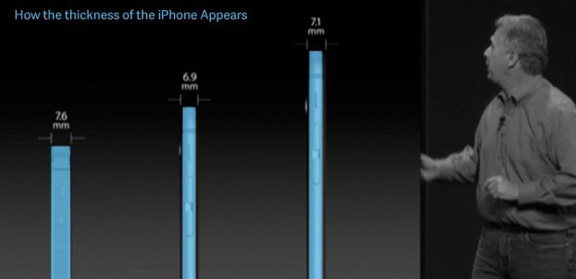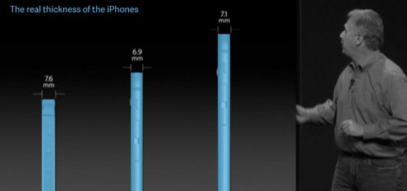 На презентации Apple показала слайд, на котором сравнила толщину iPhone 5s, iPhone 6 и iPhone 6 Plus: 7,6 мм, 6,9 мм и 7,1 мм соответственно. Блогеры подозревают, что Apple могла использовать оптический обман, чтобы завысить характеристики смартфона. Компания не учла толщину защитного стекла и задней панели смартфона. Они добавляют iPhone 6 и iPhone 6 Plus несколько десятых миллиметра. Кроме того, при подсчете толщины «шестерок» в Apple не учли высоту выступающего кольца камеры.