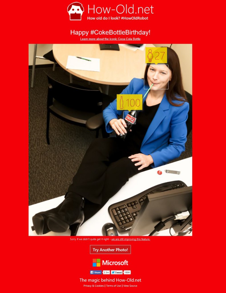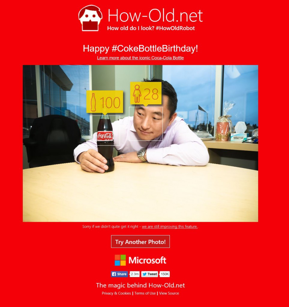 Ресурс умеет только распознавать возраст людей на фото, но в день рождения бутылки Coca-Cola разработчики из Microsoft научили эту систему машинного видения указывать и возраст фирменной тары, если она будет на снимке: