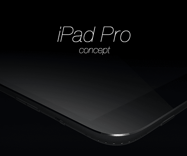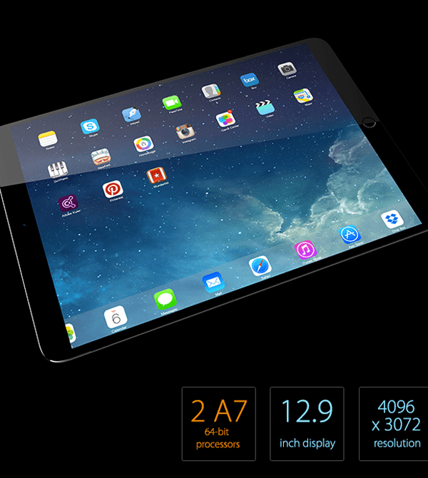 Концепт увеличенного iPad с 12,9-дюймовым экраном и возможностью одновременной работы в двух приложениях. Корпус устройства выполнен из специального ударопрочного сплава алюминия. Основная камера iPad расположена за стеклянной облочкой логотипа Apple.