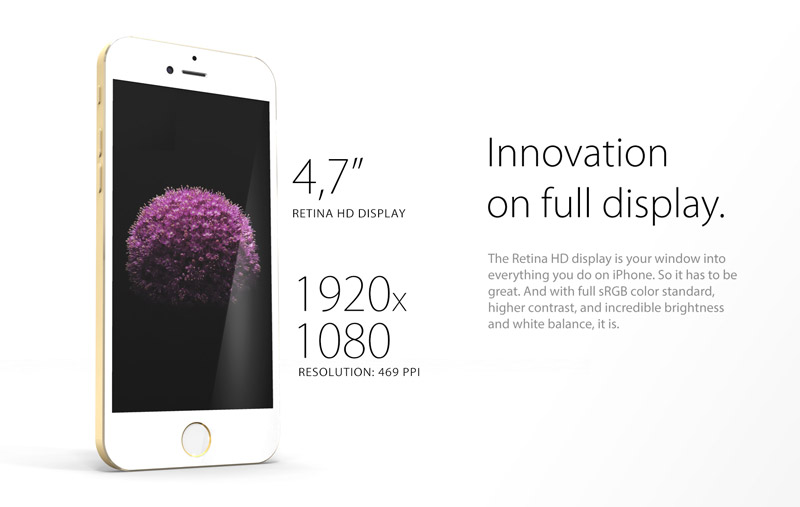По задумке дизайнера, новый iPhone 7 должен получить 4,7-дюймовый дисплей с разрешением Retina HD (1920 x 1080) и плотностью пикселей 469 ppi, который обеспечивает 100% охват цветового пространства sRGB.