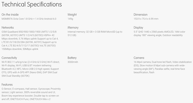 Idol 4S будет работать на базе восьмиядерного процессора (SD652 SoC) с частотами 1.8 ГГц + 1.4 ГГц и иметь 5.5-дюймовый QHD-AMOLED дисплей. Устройство будет поставляться с 3 Гб оперативной памяти и 32 Гб расширяемой встроенной памяти. Все это будет питаться от аккумулятора емкостью 3,000 мАч. С точки зрения камеры, устройство будет иметь 16-Мп заднюю камеру и 8-Мп переднюю. Idol 4S будет работать под управлением Android 6.0 Marshmallow, а также поддерживать VoLTE.