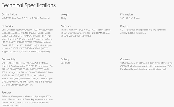 Что касается Idol 4, то смартфон будет работать на базе восьмиядерного процессора (SD617 SoC) с частотами 1.7 ГГц + 1.2 ГГц и иметь 5.2-дюймовый 1080p IPS дисплей. Спецификации устройства также включают 2 или 3 Гб оперативной памяти, в то время как внутренняя память только 16 Гб, но с возможностью расширения. Основная камера имеет разрешение 13-Мп, а фронтальная — 8. Alcatel OneTouch Idol 4 работает от батареи 2,610 мАч также на Android 6.0 Marshmallow.
