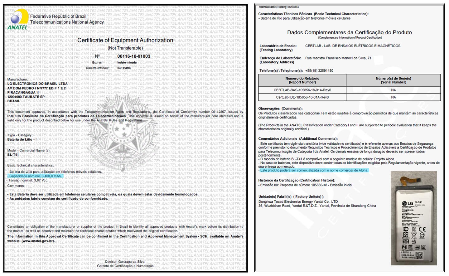 Емкость аккумулятора телефона была обнаружена в сертификационных документах, выпущенных бразильской версией FCC под названием Anatel. Сертификация была выдана для литий-ионной батареи с номером модели BL-T41.