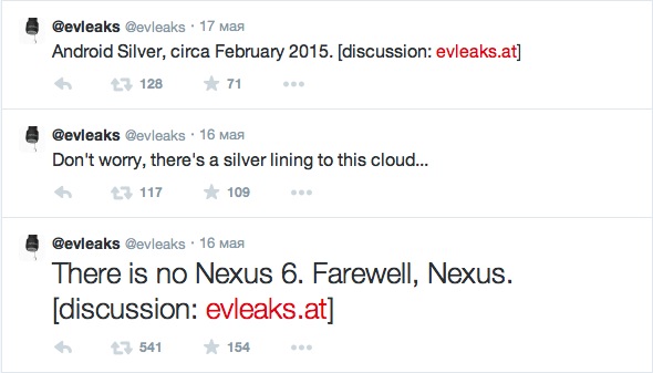 Среди ожидаемых новинок были смартфон Nexus 6 и планшет Nexus 8. Однако известный твиттер аккаунт @evleaks сообщил, что смартфона с названием Nexus 6 не будет.