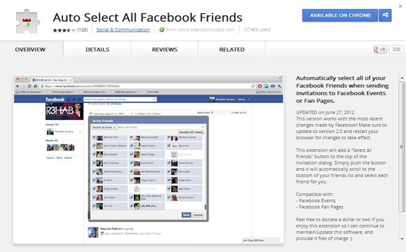 Facebook не позволяет выбирать сразу всех друзей в стандартном диалоговом окне приглашения. Приходится отмечать их по одному. Данное расширение автоматически отмечает сразу всех друзей.