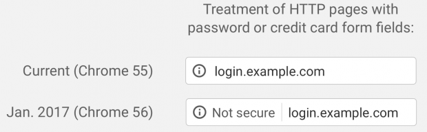 В Chrome 56 разработчики добавили серую плашку «Not Secure» для HTTP-страниц, содержащих формы для ввода пароля или номеров банковских карт.