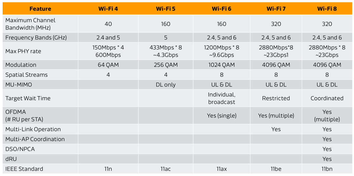 Максимальная скорость на физическом уровне (PHY) останется прежней — 2880 Мбит/с на 8 потоков, что составляет 23 Гбит/с. Используемые диапазоны частот (2.4, 5 и 6 ГГц), а также модуляция 4096 QAM при ширине канала 320 МГц сохранятся.