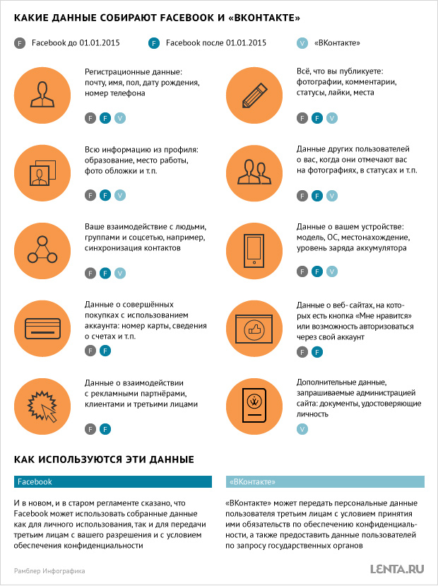 Благодаря инфографике, подготовленной изданием «Лента.ру», вы можете увидеть, какие данные собирает Facebook, сопоставив их с прошлой политикой конфиденциальности, и какую информацию хранит у себя «ВКонтакте». Выяснилось, что, по сути, Facebook и так всегда знал про нас все.