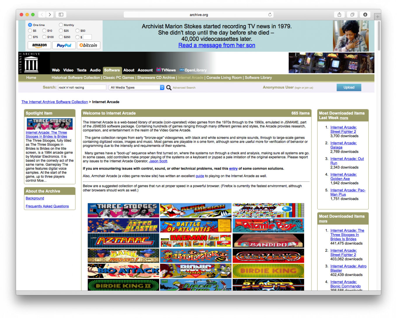 Коллекция видеоигр из старомодных аркад и игровых приставок. Собирает как классику вроде Street Fighter 2 или Frogger, так и странные вещи вроде Special Forces Kung Fu Commando или Gravitar.