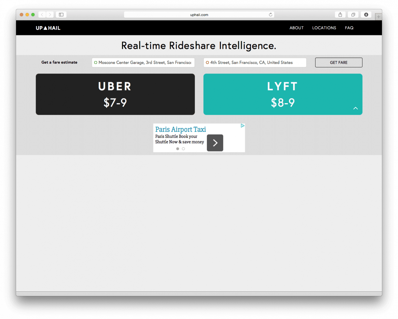 Up Hail в реальном времени сравнивает стоимость поездки на такси через различные сервисы для вызова автомобилей. Позволяет рассчитать цену для определённого количества пассажиров и типа автомобиля, также предупреждает о повышении тарифов. В декабре похожий сервис запустил российский предприниматель Рустем Богданов.
