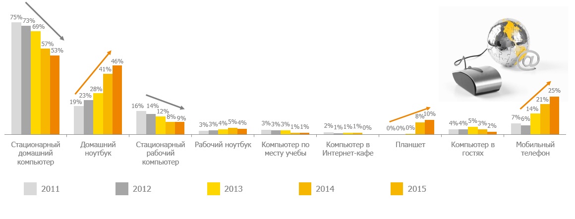 За последние 5 лет существенно изменилось место доступа к интернету. Домашние компьютеры уже почти сравнялись с лэптопами: