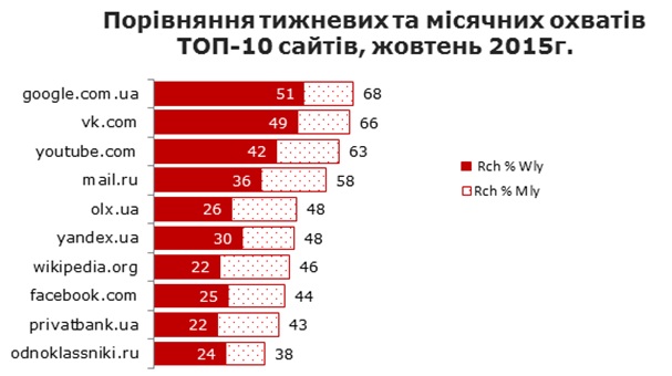 Если посмотреть соотношение недельных охватов и месячных, то у таких сайтов как Vk.com, Google.com.ua, Youtube.com выше доля регулярной аудитории, ведь прирост месячного охвата до недельной аудитории относительно невелик.