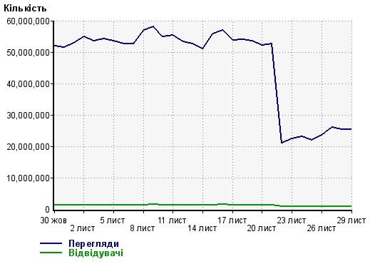 В целом, согласно данным Liveinternet, на украинские сайты еще 2 недели назад приходилось 2,7 млн просмотров страниц, после проблем с электроэнергией эта цифра сократилась до 2 млн. А в российских сайтах — с 55 млн до 23 млн.