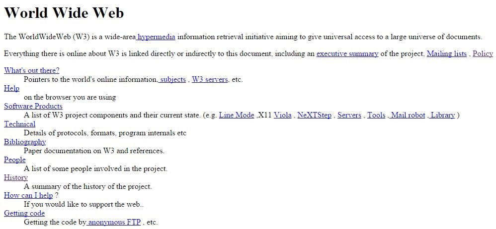 Через год после того, как была создана Всемирная паутина, стал доступен первый веб-сайт. На нем каждый мог узнать об основных характеристиках Сети, а также о том, как найти материалы в Интернете или как создать собственный сервер.