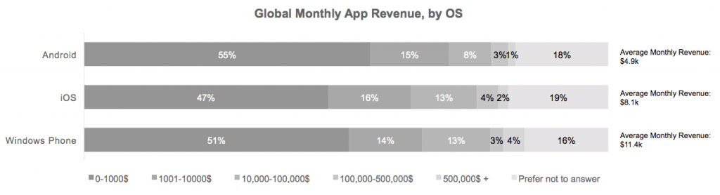 Доля продукта Microsoft среди общего количества созданного софта составляет 21% против 57% у iOS и 86% у Android. Тем не менее, это не мешает программистам зарабатывать на создании программ для Windows Phone намного больше, чем на платформах Apple и Google.
