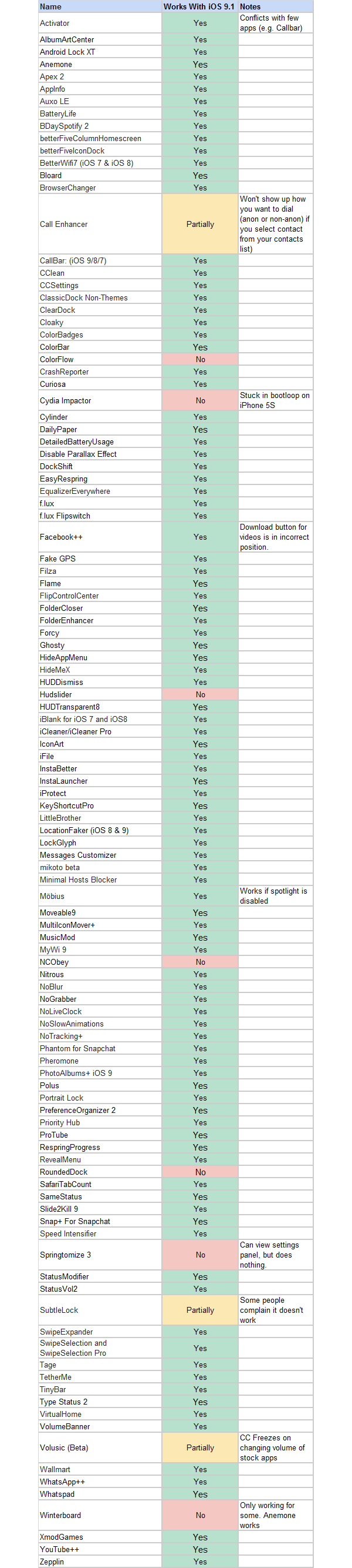 На сегодня свыше 90% популярных твиков либо полностью, либо частично совместимы с iOS 9.1. Список джейлбрейк-твиков для iOS 9.1 можно увидеть, перейдя по следующей ссылке.